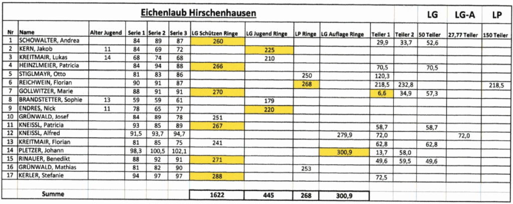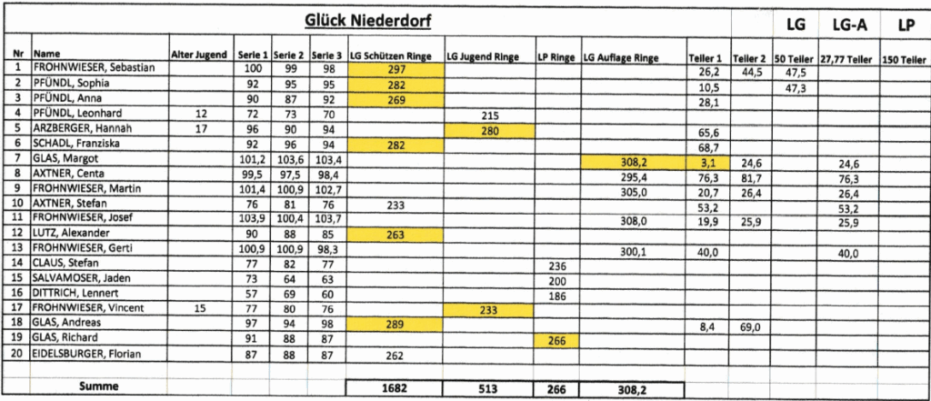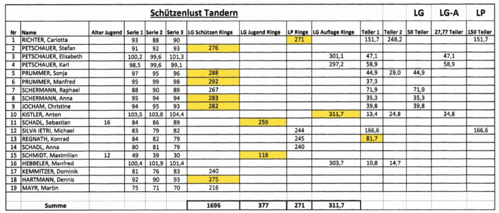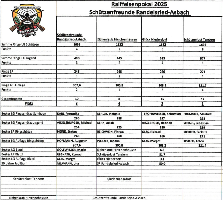 Der Gesamtsieger des Abends waren heuer wir, die Schützenlust Tandern, mit 17 Punkten vor Glück Niederdorf mit 15 Punkten, dem Gastverein Schützenfreunde Randelsried-Asbach mit 10 Punkten und Eichenlaub Hirschenhausen mit 8 Punkten.