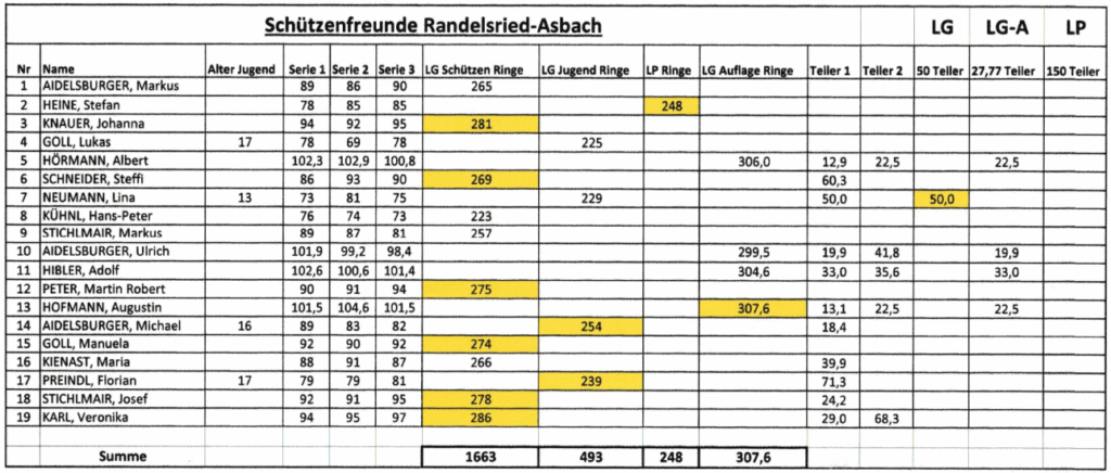 Das 50. Schießen der Volksbank Raiffeisenbank wurde von den Schützenfreunden Randelsried-Asbach ausgetragen. Es haben insgesamt 75 Schützen von den 4 Vereinen an den beiden Schießtagen Mittwoch und Samstag teilgenommen. Zum 50sten Schießen wurden die Preisgelder der einzelnen Ring- und Blattl Besten auf 20 € erhöht und es gab 2 Sonderpreise: