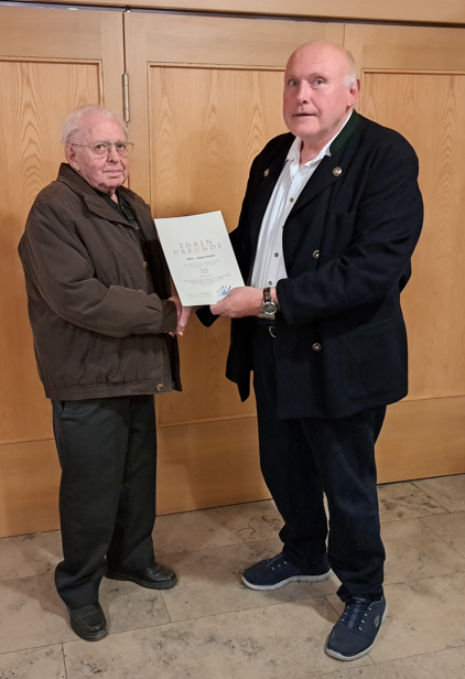 Der Schützenverein hat am Samstag Abend, 15.11.2025, zu einem Ehrungsabend für langjährige Mitglieder ins Sportheim eingeladen. Nach dem Totengedenken wurden die Mitglieder mit 40-, 50-, 60- und 70- jähriger Mitgliedschaft geehrt. Von den 29 geladenen Personen waren 18 am Abend anwesend um die Ehrung durch den ersten Schützenmeister Konrad Regnath entgegen zu nehmen.